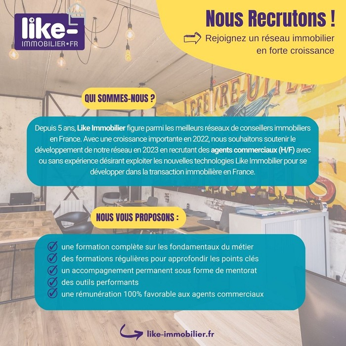 Depuis 5 ans, Like Immobilier figure parmi les meilleurs réseaux de conseillers immobiliers en France. Avec une croissance importante en 2022, nous souhaitons soutenir le développement de notre réseau en 2023 en recrutant des agents commerciaux (H/F) désirant exploiter les nouvelles technologies Like Immobilier pour se développer dans la transaction immobilière en France.